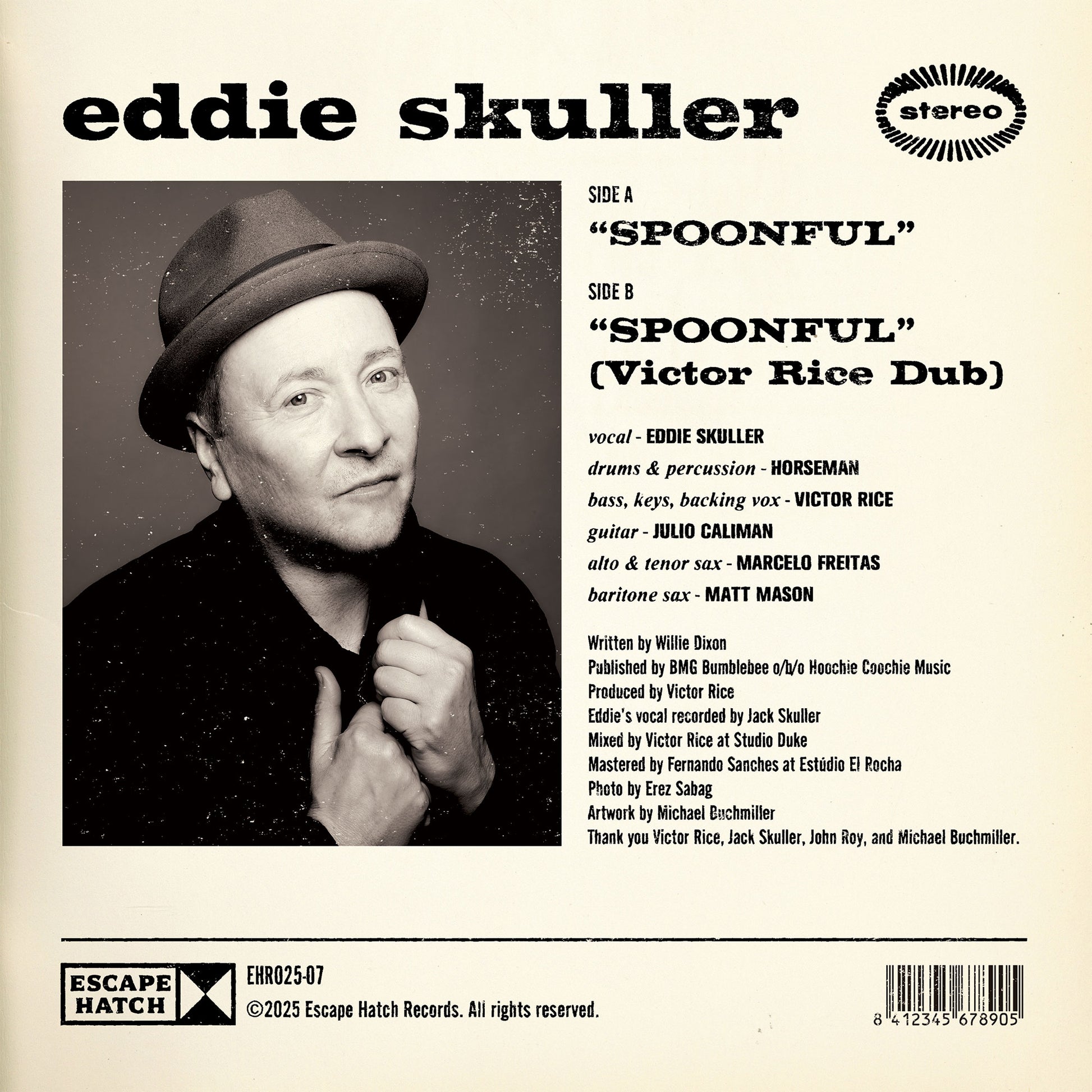 A hypnotic fusion of blues and reggae, Eddie Skuller’s “Spoonful” gets a bold reimagining on this limited edition 7” vinyl. Produced by dub legend Victor Rice, the track pulses with rich textures and a sultry, sinister energy, breathing new life into the Howlin’ Wolf classic. This Escape Hatch Records release captures the addictive pull of love and longing... one spoonful at a time.