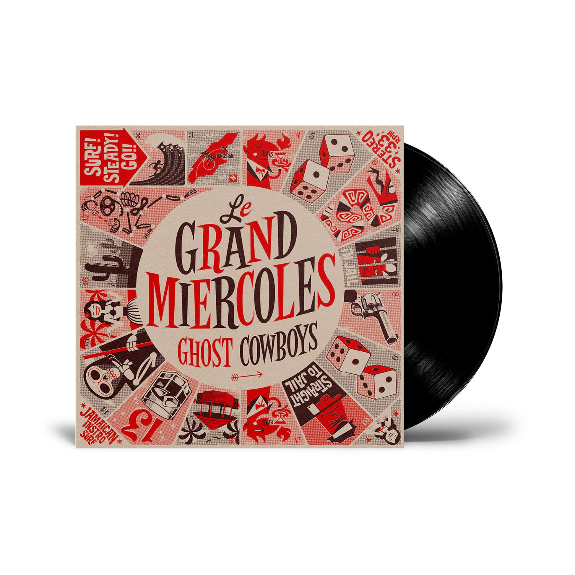 Here comes again the original reggae outlaws, surf and western inna Jamaican style, 100% instrumental. Comes with full album CD version including 'This Is Surf-Steady' album as bonus track.Dust raised by a scrawny nag ridden in a Texan twilight by a hollow-cheeked rider. Ectoplasm that in the next track transmutes into a Haitian zombie who cheerfully rocks its members with the offbeat of the drum and bass. Cinematic and atmospheric, that’s the way 'Ghost Cowboys' sounds, the second full-length LP by Le Grand Miércoles. Moving away from previous Jamaican attachments and deeper into the sonic experimentation already hinted at in ‘This is Surf-Steady’ (Golden Singles, 2011). Not in vain we face a combo that brings together the cream of musicians who have opted for the syncopated rhythms in the Peninsula; the precise, merciless and pinpoint drumming of six bullets shot from a Colt 45, by Sputnik, grafted in the nowadays so missed Malarians, and then in Los Calaveras, The Golden Singles or Dwomo. On guitar the growling and lashing Winchester of Dr.Jau (Dr.Jau & The Peanut Vendors, Ki Sap, The Shake It Up’s, Gaia Dub Sindicat, Mr.T-Bone & The Golden Singles, etc.) On bass, driving the tunes with steady hand, the cowboy who prevents (or allows...) the guitar from overflowing into a thundering stampede, Fabiani (Pataconas, Dwomo). And rounding off this Wild Bunch, Willy (The Offbeaters, Dirty Soul Riders, Teleplasticos, Huessos) with his Hammond organ beaming glitters which reverberate on the whole like the sun in Mackena’s gold.
